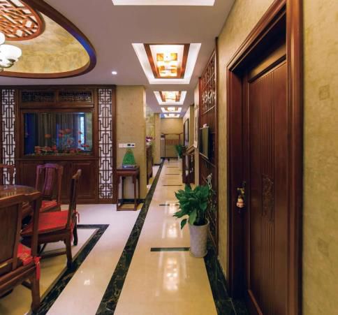 ▲棕赤色的實木門與空間的中式樣式完善匹配,統(tǒng)一了空間的總體色彩。