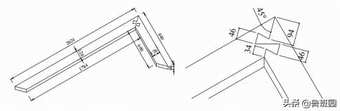 左右冒挺的尺寸為外側長度2 024 mm、內側長度1784 mm,寬度120mm,高低冒頭的外側長度840mm、內側長度600mm、寬度120mm,厚度均為40mm。左冒挺與上冒頭接合縫的角度為45°,如下圖所示,4個角均采取該接合方法。