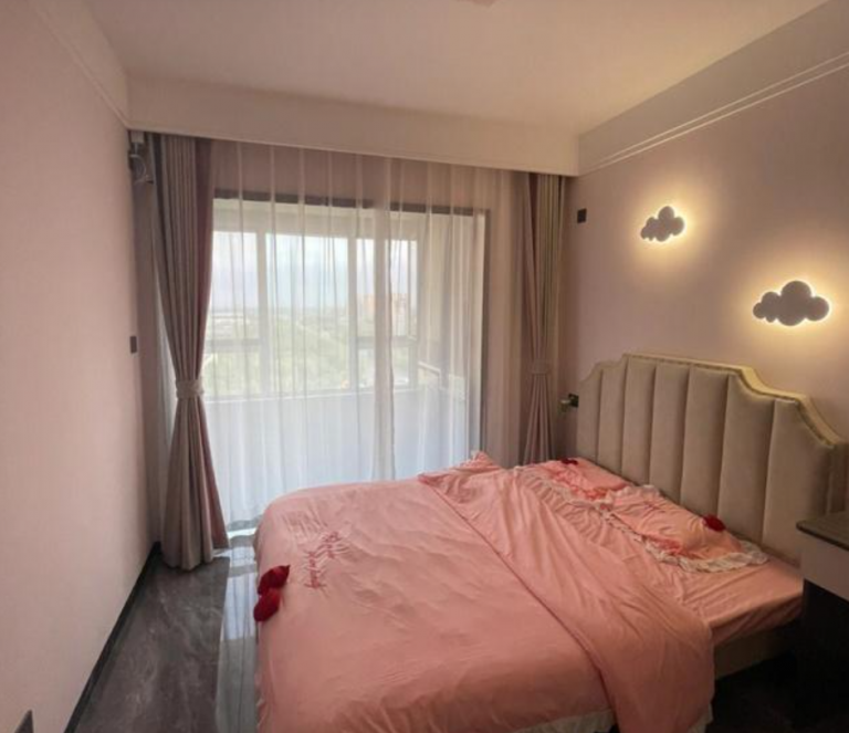 臥室空間不大,一張床加上床頭柜和衣柜基本沒有什么多余的空間了。床頭墻上安裝了網紅款的云朵壁燈,顏值非常高,可以起到很好的裝飾效果!頂面是沒有安裝吊頂,僅僅走了一圈石膏線條,看起來很有空間感。窗戶的位置設計了窗簾盒,顯得比較美觀,細節處理真心不錯!