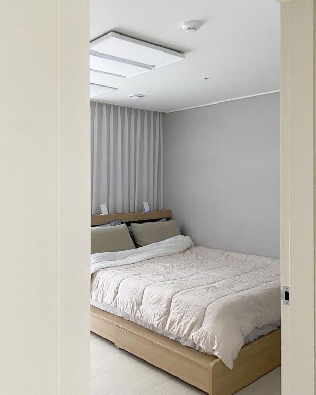 主臥空間適合大人居住,還是喜歡這種簡單舒適的布局?;疑膲γ娲钆浠疑拇昂?。木質床鋪配上棉質床單,看起來非常干凈。難怪別人都說再過10年也是流行。